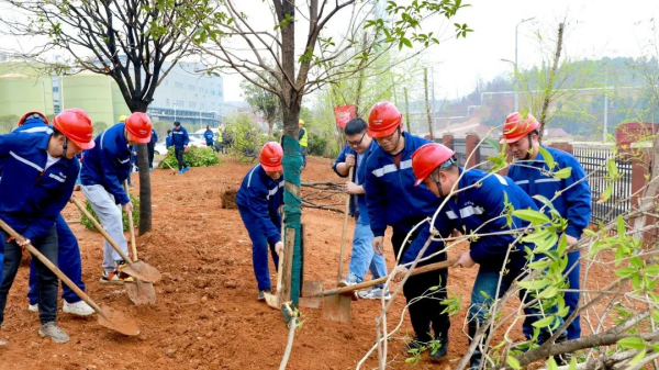 銅仁(上市主體)產業基地工會開展了植樹節相關活動,工會領導班子號召廣大員工參與到愛護園區環境的行動中,來自原料廠區、材料廠區、環保廠區、職能部門的員工代表參加了植樹活動,為園區增添新綠。