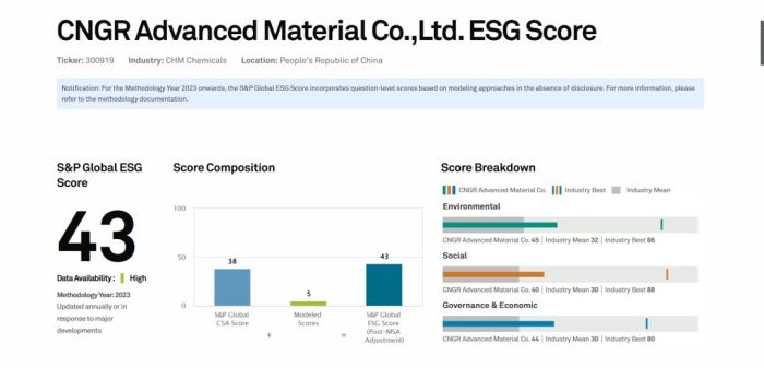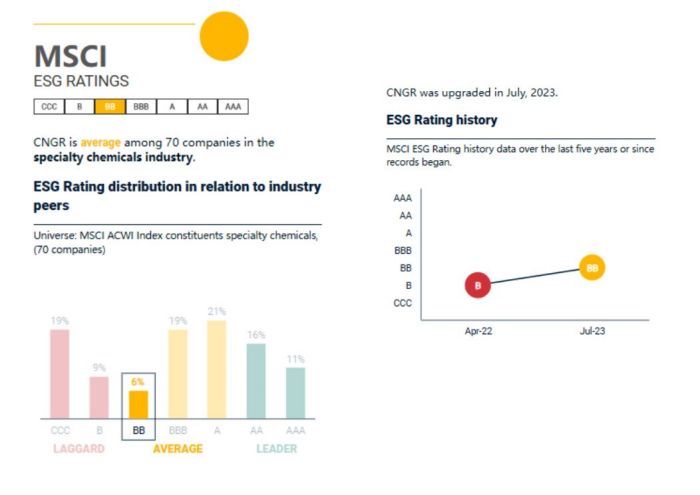 在2023年的標普CSA評分中,中偉股份得分38分,與去年相比提升了10分。值得一提的是,這一分數已達到入選“標普中國可持續發展年鑒”門檻,代表中國可持續發展標桿示范企業水平。與此同時,中偉股份在明晟的ESG評級也由2022年的B等級提升到了2023年的BB等級,這一評級結果與相關上下游企業相比,已處于中間水平。在富時羅素的ESG評分中,中偉股份也取得了2.6分的好成績,這一分數已顯著高于行業平均水平。