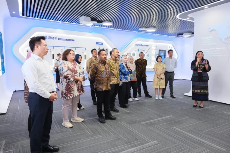 在中偉科技館和全球研發中心參觀通道,Tri Winarno局長一行對中偉的一體化產業以及研發體系表示出濃厚興趣。劉一介紹道,中偉股份已建立起“資源開發-材料智造-循環回收”的新能源材料產業生態,結合行業領先的生產工藝,充分發揮資源的利用價值,助力產業可持續發展;同時,中偉研發投入逐年提升,國際化產學研用體系不斷完善,通過行業超大規模研發車間推動前端研發成果轉化落地,以科技創新驅動公司高質量發展。