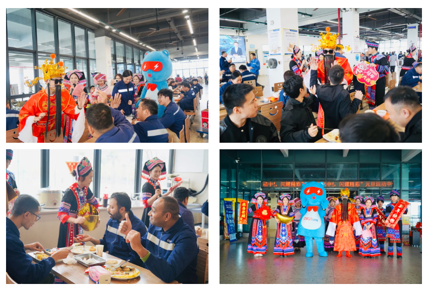 基地形象大使團也迎來了“驚艷首秀”。他們與活潑可愛的“鋰電寶寶”、喜氣洋洋的“財神爺”共同集結,組成了一支活力滿滿的送福小分隊。在濃厚的節日氛圍中,這支“福氣天團”通過創意十足的互動與沉浸式文化體驗,正式拉開了基地辭舊迎新、共赴新篇的華麗序幕?!盎芋w驗巡游”環節點燃了全場最高熱情。員工們爭相與“財神爺”大力擊掌、擁抱“金元寶”,在響亮的掌聲中“掌”握新年好彩頭。“接福挑戰”更是一場智慧與默契的較量,大家妙語連珠,接力送出“一馬當先”的節日祝福。摩洛哥同事也深受感染,熱情加入其中,中外伙伴歡聚一堂,在歡聲笑語間繪就了一幅跨越國界的文化交融新春圖景。