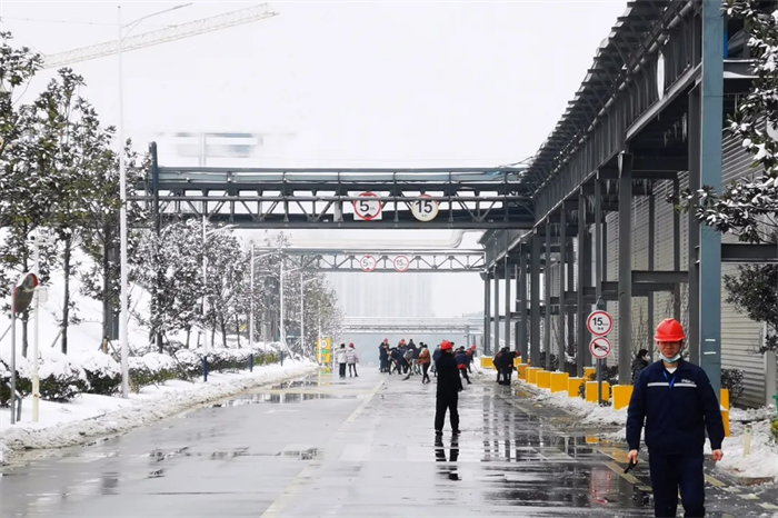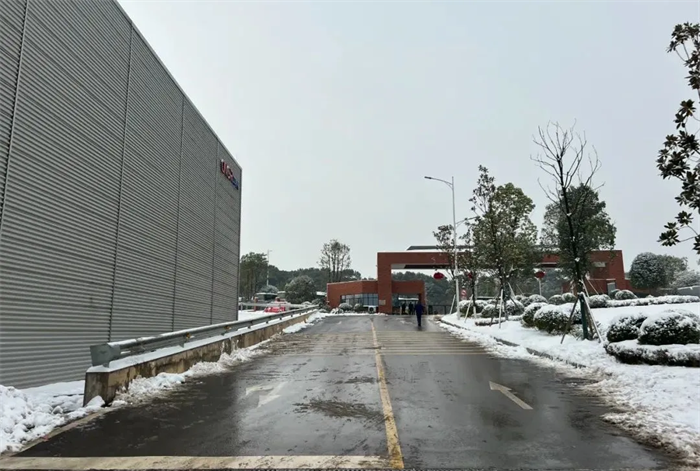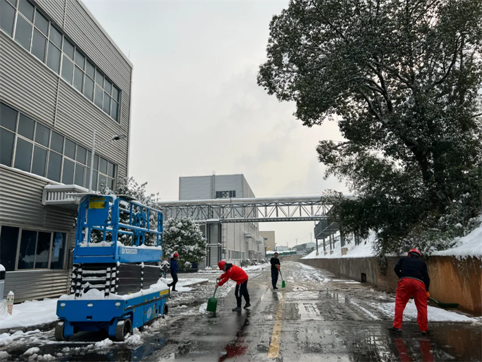 面對突如其來的大雪,西部、中部產業基地迅速形成系統完備、科學規范、運行有效的掃雪除冰工作體系——EHS部通過提前考察研判、及時發布警示通知、成立應急工作小組等方式積極應對,對現場情況仔細巡檢,組織人員清掃主干道區域積雪、潑灑鈉鹽,對被積雪壓斷樹枝影響通行的路段進行封閉和設置警戒標志。與此同時,行政后勤全力調度,加開通勤班車、布置臨時客房、熬制暖身姜茶……全力做好后勤保障工作。