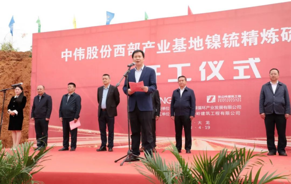 4月19日上午,中偉股份西部產業基地舉行鎳锍精煉硫酸鎳項目開工儀式。貴州省銅仁市政府副市長黃進出席儀式并為項目宣布開工,大龍開發區黨工委書記陳代才出席活動并講話,市政府副秘書長楊淵,市工信局局長肖寧,市促進局局長肖南,開發區黨工委委員、黔開公司黨委書記、董事長、總經理游先勝,開發區黨工委委員、管委會常務副主任宋雨,中偉股份西部產業基地總經理張朝華,中偉新材料黨委副書記、總經辦主任羅丹丹等領導出席活動。儀式由開發區黨工委副書記、管委會主任姚元貴主持。市、區相關部門負責人,基地各部門、車間代表參加此次開工儀式。